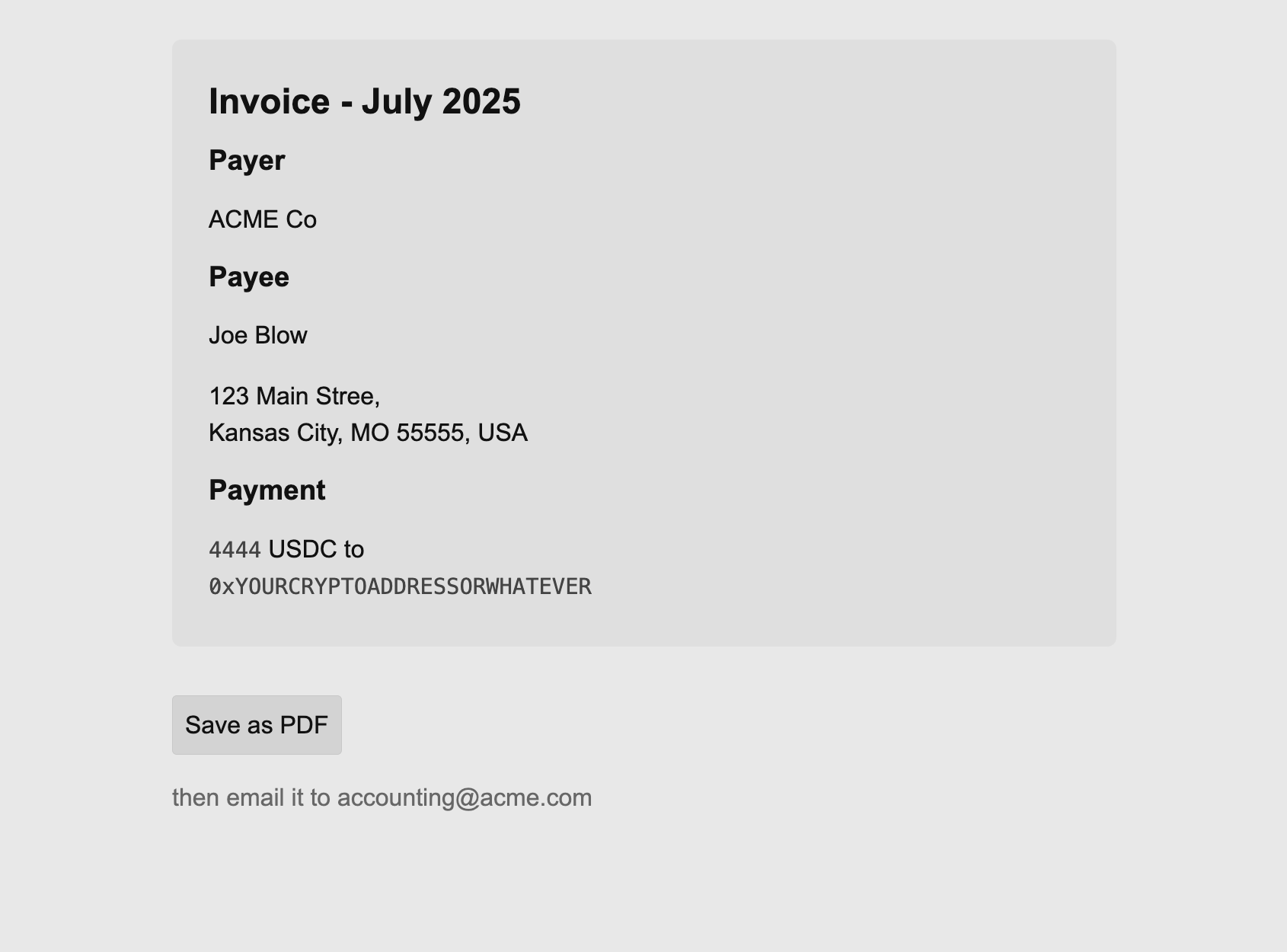 =+ ;= :: write pdf here with udon # Invoice - July 2025 ### Payer ACME Co ### Payee Joe Blow 123 Main Stree,\ Kansas City, MO 55555, USA ### Payment `4444` USDC to\ `0xYOURCRYPTOADDRESSORWHATEVER` == :: :: :: :: :: :: :: :: :: :: :: :: :: =/ body - ;div.page.prose ;div.br2.b1.p-3 ;div#main.prose:(*body) == ;button.p2.bd1.b2.br1.hover.mt2 =onclick "printEl()" ; Save as PDF == ;script ;- %- trip ''' function printEl() { const main = document.getElementById('main'); const title = document.querySelector('#main h1')?.textContent || 'Invoice'; const printWindow = window.open('', '', 'height=500, width=500'); printWindow.document.write(` <html> <head> <title>${title}</title> ${document.head.innerHTML} </head> <body>${main.outerHTML}</body> </html> `); printWindow.document.close(); printWindow.focus(); if (printWindow.document.readyState === 'complete') { printWindow.print(); printWindow.close(); } else { printWindow.onload = () => { printWindow.print() printWindow.close(); } } } ''' == ==